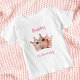A white, light coloured t-shirt Decorated with a crown shaped photo frame. Personalise and add a name. Pink handwritten style script.