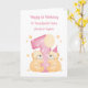 This watercolour 1st birthday card is for twin girls. The design includes stars, a birthday polka dot number 1 in pink, a balloon, and two teddy bears. The children's names have been included on the front of the card.