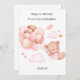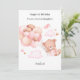 Celebrate a special birthday with this adorable and whimsical card featuring a cute teddy bear floating among fluffy clouds and holding a bouquet of pastel balloons in blue, peach, and beige tones. The cheerful design is accompanied by playful details like stars and a charming little bird. Perfect for children or anyone who loves sweet and charming designs, this card is personalised with the recipient's name for a thoughtful and unique touch.