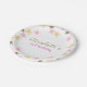 This pretty pink "twinkle twinkle little star" themed birthday paper plate is perfect for a baby girl's first birthday party. It features a star pattern on a white background, faux glitter accents, and text that you can customise with your own details. The template is customisable in the listing editor.