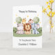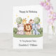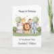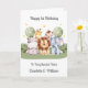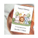 This watercolour 1st birthday card is suitable for twins or a single child. The design includes a birthday number 1 in green, two birthday balloons, and five safari animals (hippo, giraffe, lion, monkey and elephant). Child's name has been included on the front of the card.
