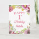 1st Birthday Watercolor Floral Flowers Pink Card with personalised name and age. For further customisation, please click the "Customise it" button and use our design tool to modify this template.