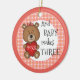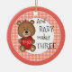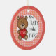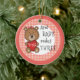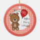 Congratulations on your first child. A beautiful daughter. Make her a Christmas keepsake ornament the family will cherish for many Christmases to come. Little girl teddy bears with their hair bows decorate the front and back of the ornament. Solid salmon pink trim with a plaid text circle border is the backdrop for bears, a balloon and heart. Add the baby's name to make this a one-of-a-kind keepsake gift for your family or for the new parents in your life. Perfect for a baby's first Christmas ornament, too. We also have a boy's ornament. See more at Zigglets here at Zazzle.