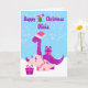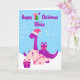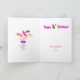 A fun Dinosaur 1st Christmas card with a pale pink and purple glitter cartoon dinosaurs wrapped gifts / present and a background of a blue sky with falling snow flakes. Happy first Christmas as decorative festive typography. Would make a lovely Xmas holiday card to give to any little girl who loves dinosaurs. The inside left side of the card has the cute pink Pterodactyl Dinosaur carrying Christmas bells. Personalise with a name and add to / amend the inside message. " , lots of love"