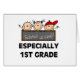 Three stick figure kids with big smiles hold a writing board that reads "School is Cool!" and black text reads "Especially 1st Grade" on 1st grade School is Cool T-shirts, mugs, buttons, magnets, stickers, cards, and other items perfect for kids who are in first grade and first grade teachers!