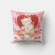This sweet pillow for a baby boy's very First Valentine's Day features a cute teddy bear sitting on a blanket against a large red heart. He is holding a baby's pacifier and bottle and is smiling as a toy made of safety pins wiggles by. It can be customised with your baby's name.