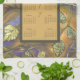 2017 Calendar Leaves Kitchen Tea Towel has undulating leaves border, leaves from a raspberry bush, art by Kristie Hubler, in greens, camel gold, periwinkle blues, & navy.