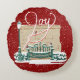 Round throw pillow with Christmas Joy as its theme. Lovely snowy park scene illustrated with peaceful park bench and little birds. Enjoy celebrating Christmas with family and friends! — L Diane Johnson