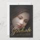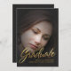 Beautiful misty filter photo overlay with elegant faux gold foil stamped handwritten script. Optional photo insert and graduation party invite text on classic pinstripe backer. Best for darker photo.