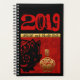 In a square are 2 pigs: one (black papercut Chinese style) seems to come sniff a golden papercut shape (inside is the second pig with the Chinese symbol). Behind them there is a red background formed by large decorative and ornamented letters with the words: "Pig Year" and at the top "Year of the Pig" + large 2019. Design on spiral planner with black background. You can easily change year (font, colour, size and position) by clicking the customise button. Matching office products, home products, greeting card, postcard, craft products and more. Perfect for Chinese New Year 2019 of the Pig or birthday (people born in the Pig year).