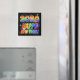 The front of this magnet design features the year number "2020" and the message "HAPPY NEW YEAR!" having a colourful rainbow spectrum inspired gradient pattern. The front also features a celebratory bursting fireworks inspired pattern. This might be a fun gift to give somebody in celebration of New Year's Day 2020.