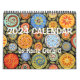 This 2024 Calendar features colourful, whimsical, folk art abstract artworks done by artist Karla Gerard, a well known artist from the USA. There are winter cityscapes, patterned landscapes with hills and houses, an occasional barn, swirl trees, flowers, birds and, of course, you will find a cat by some of the front doors or in a window peering out.