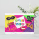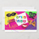 Happy Purim Modern Greeting card. Translation from Hebrew: Happy Purim! Purim Jewish Holiday poster with stars of David, traditional Hamantaschen cookies, gragger toy noisemaker, balloons, musicians, masks, Purim basket, festive confetti, fireworks colourful background. "Wish a great Purim celebration" lettering. Carnival, Masquerade, Festival, Kids Party, Israel. Invitations & Stationery > Greeting Cards > Holiday & Seasonal. Design with text template. Personalise them by adding name or wishes text.