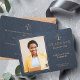 Modern elegant navy blue leather look and copper gold law school graduation announcement card template with your custom photo and text. ++++++++++ Easy to personalise on both sides!