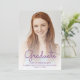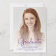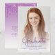 Trendy modern graduation announcement featuring a custom vertical photo. The word "Graduate" appears in purple handwriting script overlay, with the graduate's name, school and year of graduation below in sans serif font. Easily replace the sample image with your own graduate's photo. A white gradient screen helps ensure the text pops. Add details about your graduate's accomplishments and future plans on the reverse, which features a purple dripping faux glitter border on an ombre background.