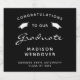 Celebrate your graduate's milestone in style with these custom graduation sparkling wine bottle labels, featuring the words "Congratulations to our Graduate" in white text on a black background, decorated by a pair of white mortar board caps. The word "Graduate" appears in a graceful handwriting-style script. Personalise it with the grad's name, school, and year of graduation.