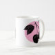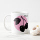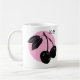 Cherry woodcut design on pink circle on white mug.