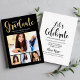 Simply stylish black graduation announcement card and party invitation features "Graduate" in a trendy real foil calligraphy script with a modern photo collage of four (4) photos of the grad. Two-sided card design includes "Let's Celebrate" graduation party wording and details on the back. Classic black and white design with gold foil coloured accents.