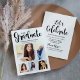 Simply stylish graduation announcement card and party invitation features "Graduate" in a trendy calligraphy script with a modern photo collage of four (4) photos of the grad. Two-sided card design includes "Let's Celebrate" graduation party wording and details on the back. Classic black and white design colours.