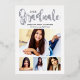 Simply stylish white graduation announcement card and party invitation features "Graduate" in a trendy real foil calligraphy script with a modern photo collage of four (4) photos of the grad. Two-sided card design includes "Let's Celebrate" graduation party wording and details on the back. Classic black and white design with silver foil coloured accents.