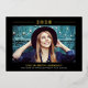 Two-sided black card design features a simple real gold foil high school graduation announcement on the front with an invitation to a graduation open house party on the back. Personalise the front with a landscape format senior photo and customise the modern white text with the class year, graduate's name, and school they are graduating from. Include all of the important party details on the back. Minimalist style design features an accent stripe on the front.