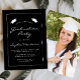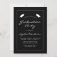 This classic, modern graduation party invitation features white text in a thin white rectangular border on a black background. The word "Graduation" and the name of the graduate appear in casual modern handwriting font beneath a pair of white mortar board caps. Customise the invitation with party details, and replace the sample image on the back with a photo of your grad.