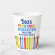 These cute 2025 preschool graduation party cups feature a cool grad cap above colourful writing and a row of crayons in rainbow. Fun PreK graduate party decor in fun colours for the last day of elementary school. Congratulations to our Pre-K graduate!