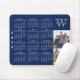 This personalized 2026 photo calendar mouse pad is easy to customize with your pictures, family name and an initial letter using the template. This design is in navy blue and white.