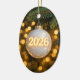 A glass ornament signifying the year 2026 dangles from a pine tree branch, illuminated by the warm glow of soft golden lights.