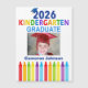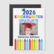 This fun 2026 kindergarten graduation announcement magnet features a cool grad cap above colorful writing and a row of crayons in rainbow. Cute kindergartner graduate keepsake magnets in fun colors for the last day of elementary school with your kid's photo and name personalized in blue. Congratulations to our kinder graduate!