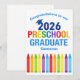 This adorable 2026 preschool graduation card features a cool grad cap above colorful writing and a row of crayons in rainbow. Cute customizable Pre-K graduate congratulations card in fun colors for your preschooler with your kid's name personalized in blue. Congratulations to our PreK grad!