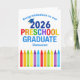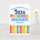 This fun 2026 preschool graduation card features a cool grad cap above colorful writing and a row of crayons in rainbow. Cute customizable Pre-K graduate congratulations card in fun colors for your preschooler with your kid's name personalized in blue. Congratulations to our PreK grad!