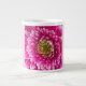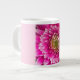 A bright pink flower covers the front of this mug.