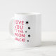 "LOVE YOU TO THE MOON & BACK!" is written in a beautiful red font, surrounded by the moon and the stars in a black silhouette design on both the front and back of this jumbo, 20 Oz coffee/tea mug. Look for matching greeting cards, gift bags, and wrapping paper in my Zazzle store for a custom gift package for family and friends. Thanks for visiting my store today. www.zazzle.com/store/deenavision