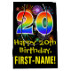 This colourful, exciting, and fun birthday-themed giftbag design features a large number "20" with a rainbow spectrum gradient inspired pattern, along with the message "Happy 20th Birthday,", and a customisable recipient name. It also has a colourful background pattern inspired by the appearance of bursting celebratory fireworks. A birthday themed gift-bag like this might be used when giving a gift or present in celebration of somebody’s 20th birthday. [~Z0000509]
