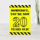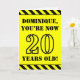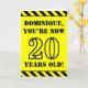 The front of this attention-grabbing and fun birthday-themed greeting card design features a customizable name and the message "YOU’RE NOW 20 YEARS OLD!" in black stencil inspired text on a yellow colored background. There is also an eye-catching yellow and black striped pattern at the top and bottom edges of the front. The inside features a customizable birthday greeting message, or could perhaps be cleared and left blank if a message is to be written by hand instead. A custom birthday card like this might be a fun way to send birthday wishes to somebody who is celebrating their twentieth birthday. [~Z0000413]