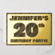 The front of this bold twentieth birthday party/celebration foil invitation card features a customisable name, a large number “20th”, the message “BIRTHDAY PARTY!”, and a border, all featuring a rustic, yet sophisticated, faux wood grain appearance inspired pattern. The back features personalised details about the event, such as the date, time, venue/place, and any other information that may be useful. Personalised invitations like these might be used to invite attendees/guests to a birthday party being held to honour somebody’s 20th birthday. [~Z0000595]