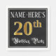 This opulent and ornate birthday paper napkin design features a customizable name and the message “20th Birthday Party”. The large number “20th” has a faux/imitation gold-inspired coloring pattern, the words “Birthday Party” are in fancy script-style text, and the background is colored black by default (although it can be customized). Elegant, luxurious paper napkins like this might be used at a birthday celebration being held to celebrate somebody’s 20th birthday. [~Z0000565]
