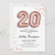 20th birthday party invitation. Elegant design in faux glitter rose gold. Invite card features rose gold number 20 balloons and script font. Perfect for a stylish bday celebration. Message me if you need custom age.
