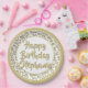 This numeric design has a black and gold random number pattern with a gold milestone number 20 repeated in varied sizes and angles. There is a white circle in the centre for your text and gold-and-white rings around the rim.