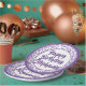 This numeric design has a purple and white random number pattern with a purple milestone number 20 repeated in varied sizes and angles. There is a white circle in the centre for your text and purple-and-white rings around the rim.