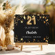 A stylish black background with faux gold stars. Add your name, and text. Age number is written with a balloon style font.