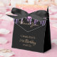 Elegant, classic, glamourous and girly for a 21st birthday party favours. A black background. The text: 21st Birthday and Thank You, written with a modern hand lettered style script. Decorated with faux glitter drips, paint dripping look in rainbow colours: purple, pink and rose gold. Personalise and add a name and a date. Golden coloured text.