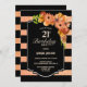 Black and faux glitter coral striped floral 21st birthday party invitation.