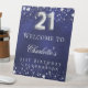 A welcome sign for a 21st birthday party. A navy blue background with elegant faux silver stars. The blue colour is uneven. Personalise and add a name and text. White letters.