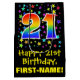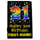 This colourful, fun, and exciting birthday-themed gift bag design features a large number "21" with a rainbow spectrum gradient inspired pattern, along with the message "Happy 21st Birthday,", and an editable recipient name. It also has a background pattern featuring star shapes of various sizes and colours. A gift bag like this might be used when wrapping gifts being given to somebody in celebration of their twenty first birthday. [~Z0000510]