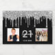 For a fun, glamourous 21st birthday party. Classic black background colour, decorated with faux silver glitter drips, paint dripping look. Personalise and add a name, age 21 and a date. Date of birth or the date of the party. White and grey coloured letters. Add 2 - two of your own photos of herm her friends, family, kids, dream travel destination, kids, boyfriend/husband.