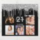 For a 21st birthday party, celebrating her life with a collage of 5 of your own photos.  Personalise and add a name, age 21 and a date.  Date of birth or the date of the party.  White and grey coloured letters.  Classic black background colour, decorated with faux silver glitter drips, paint dripping look.