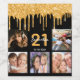 For a 21st birthday party, celebrating her life with a collage of 5 of your own photos. Personalise and add a name, age 21 and a date. Date of birth or the date of the party. White and golden coloured letters. Classic black background colour, decorated with faux gold glitter drips, paint dripping look.