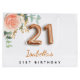 For an elegant and feminine 21st birthday party. A chic white background. Decorated with a rose gold and blush pink watercolored rose flower, floral, green eucalyptus leaves, sprigs, greenery and faux gold sprigs. Personalise and a name. Black and golden letters. The name is written with a modern hand lettered style script. Number 21 is written with a golden balloon style font.